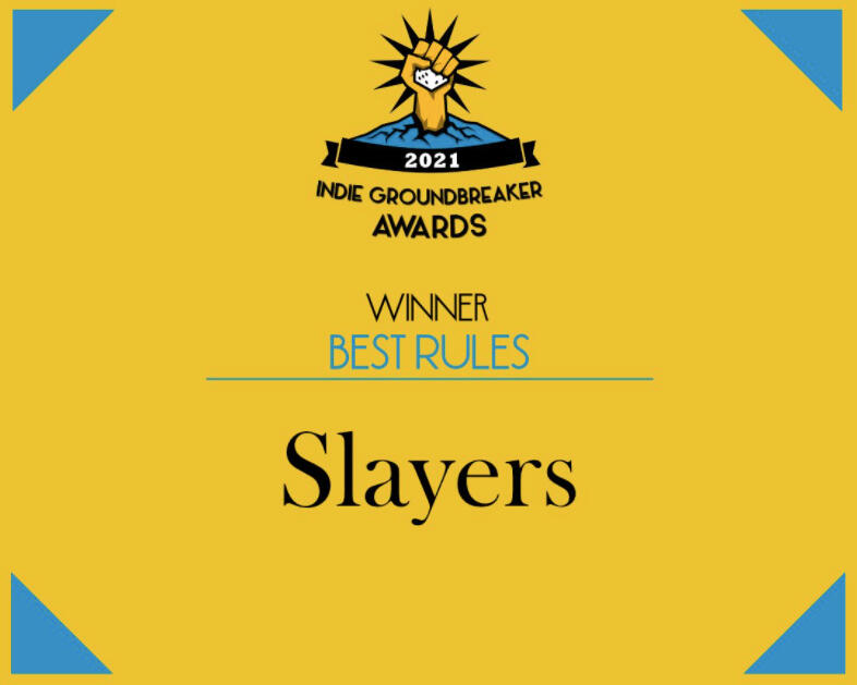 Slayers is the winner of the 2021 Indie Groundbreaker Award for Best Games!Slayers was nominated for 3 ENNIES: